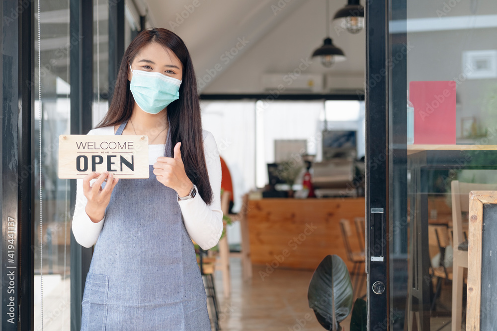 Young Asia girl wear face mask turning a sign from closed to open sign after lockdown.