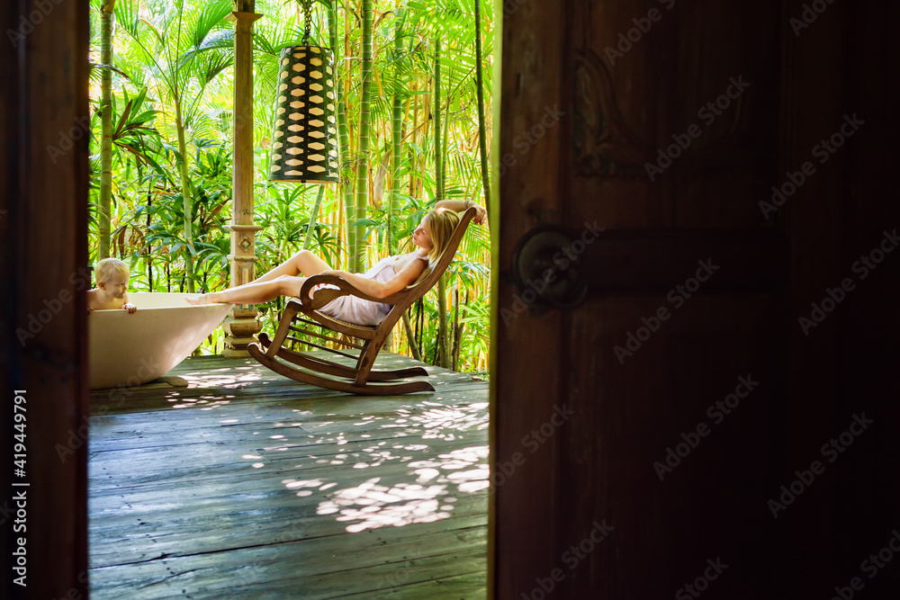 Happy baby boy have fun in bathtub, young mother relax on rocking chair in outside bathroom on veranda with beautiful tropical garden view at luxury villa on summer family vacation.