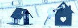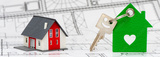 Modellhaus steht auf Bauplan mit Hausschlüssel