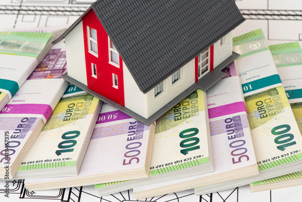 Modellhaus steht auf Bauplan mit Euro Geldscheinen