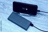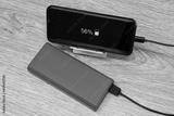 Portable charger charges a smartphone on a wooden table. Power bank with telephone and cable.