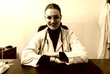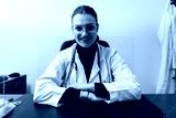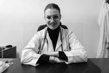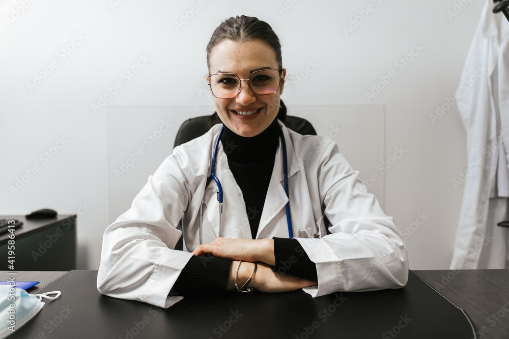 Confident portrait of a female doctor at her desk in the clinic from the patient's point of view, smiling with neighbor her protective face mask during the Coronavirus Covid-19 pandemic and looking