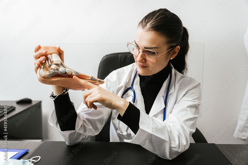Portrait young professor of medicine points to a part of the foot on a sample model during a university lecture to students - Surgeon doctor explains and shows the patient the diagnosis of his disease