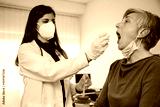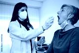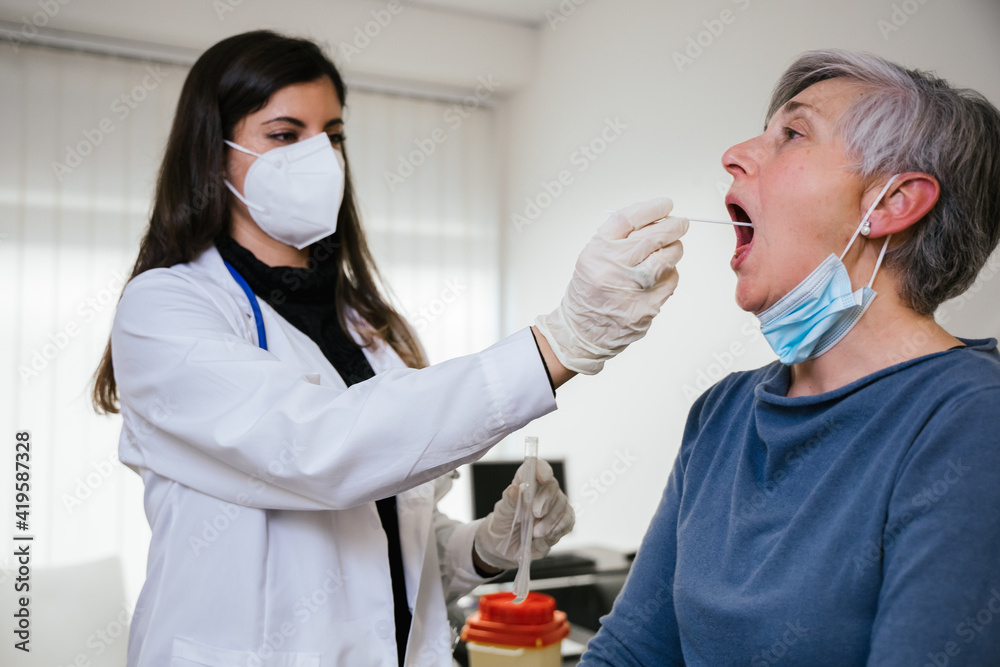 Healthcare worker performs mouth swab adult woman in the clinic - Doctor takes sample with tester from the patient to check if positive for Coronavirus Covid-19 infections during pandemic - Copy space
