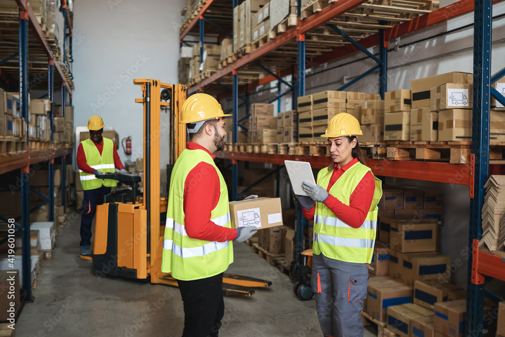 Multiracial workers talking inside warehouse store - Focus on woman face