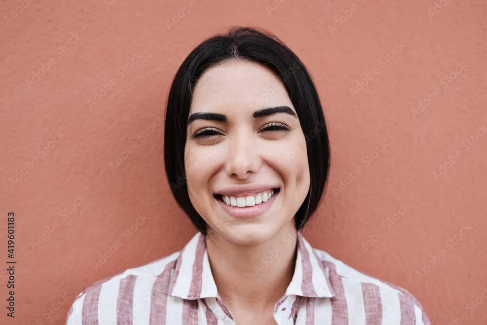 Young latin woman smiling on camera - Focus on face