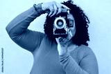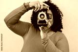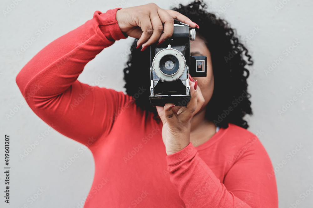 Young african woman using vintage camera outdoors in the city - Focus on lens