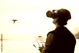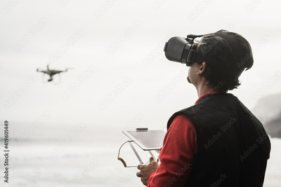 Engineer drone pilot flying with quadcopter outdoor on the beach - Focus on face