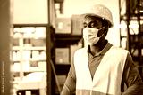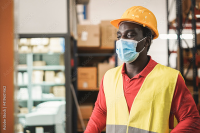 African man working inside warehouse while wearing safety mask during coronavirus outbreak - Focus on face