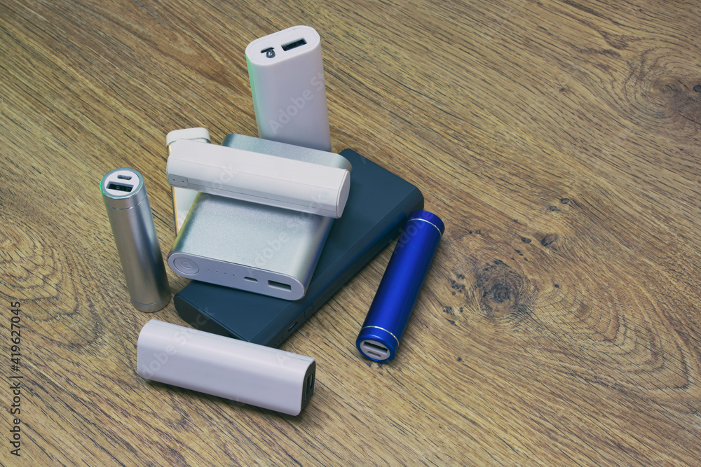 Set of power banks of different sizes on a wooden table. Choosing a portable charger.