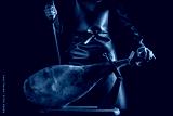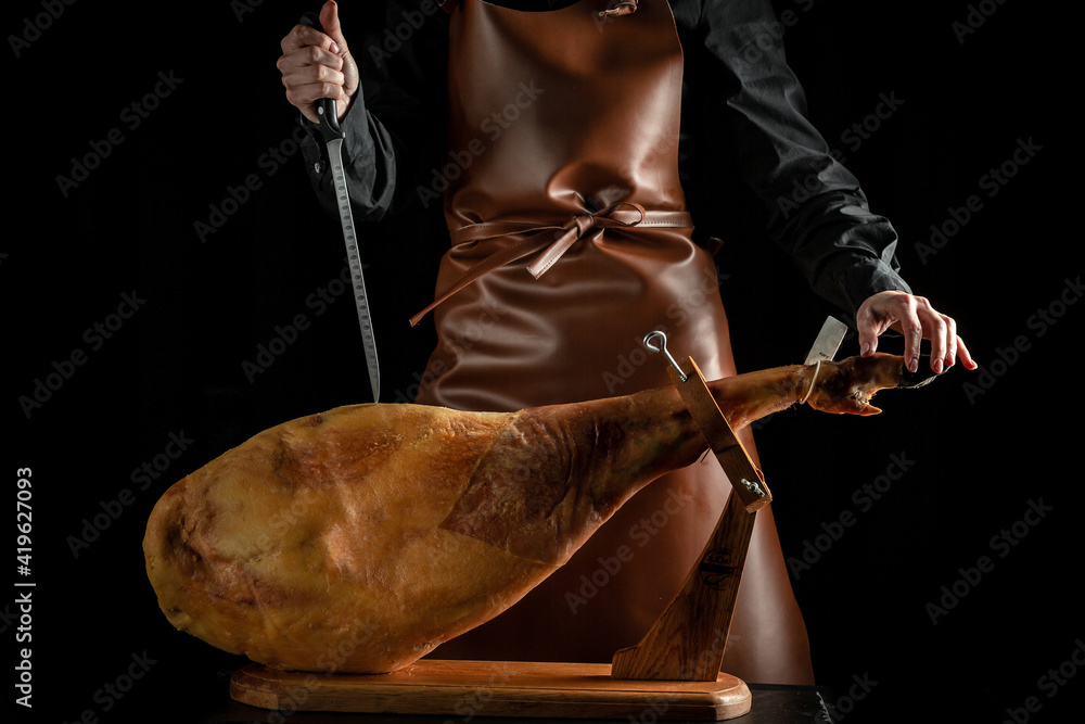 Hamon is forty-eight weeks old. Spanish jamon and traditional food, Jamon Serrano, Bellota, Italian Prosciutto Crudo or Parma ham, whole leg on black background