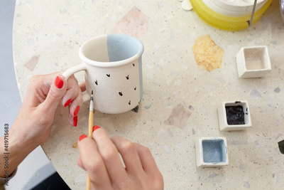 Women's hands apply a simple pattern to a ceramic teacup. Learning new skills, improving skills, hobbies.