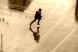 A boy running splashing under rain on street road. top view. Child having fun during rain. Spring outdoor activity for kids. Freedom and happy childhood lifestyle. He wear coat and blue shoes.
