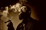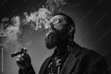Elegant man in retro style poses in dark background smoking cigar. Portrait of a bearded guy with stylish coiffure.