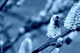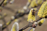 Honey bee on Goat willow flowers. Apis mellifera on Salix caprea tree in bloom