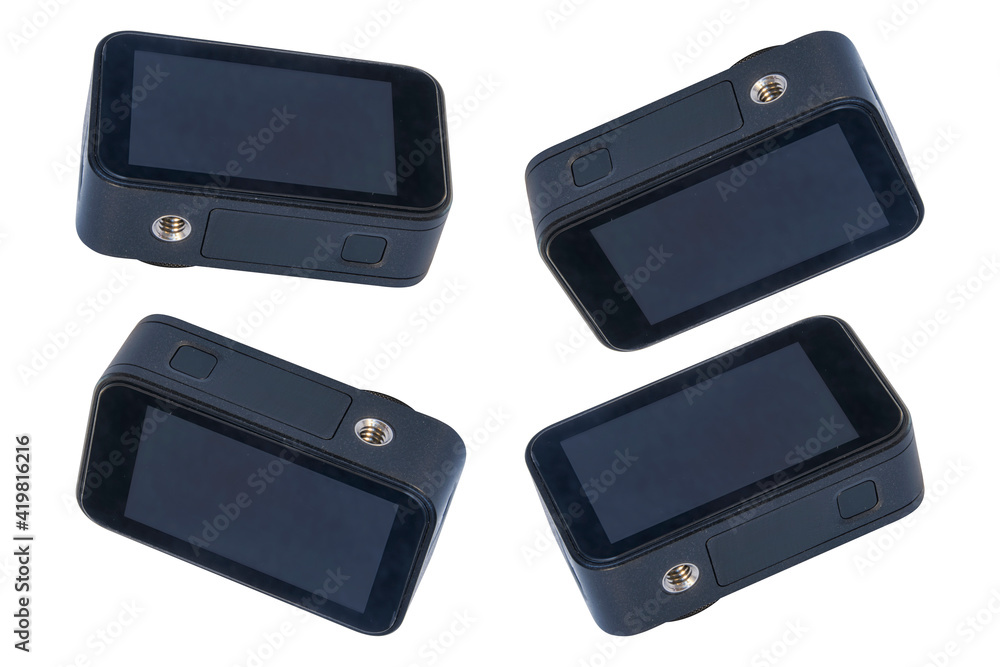 Set of compact action cameras of different angles isolated on a white background for shooting photos and videos.