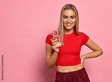 Healthy young blonde woman in sport suit holding a glass of water isolated on pastel background