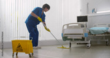 Asian male nurse washing floor with mop in empty hospital ward