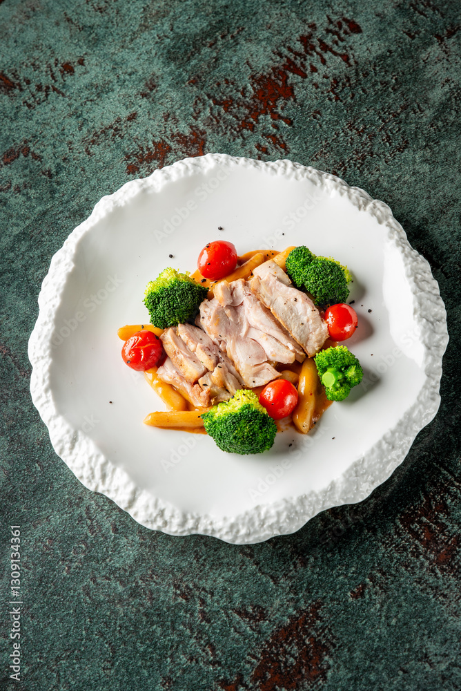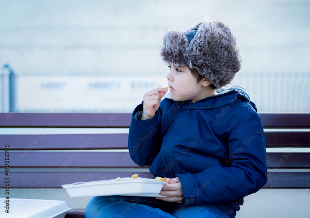 Happy kid enjoying eating potato chips for sunday lunch, Cute boy eating french fries. Child siting on bench having picnic outdoor in sunny day Spring