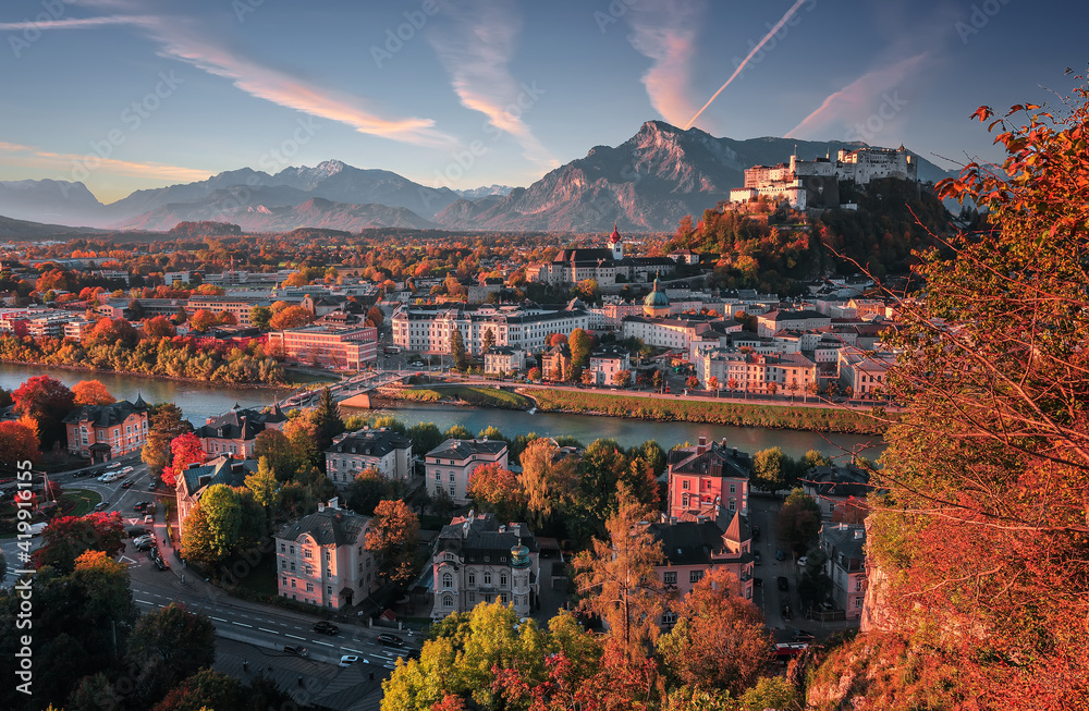 Wonderful Autumn view on Salzburg city during sunrise. Concept of ideal resting place. Popular travel destination of Europe.