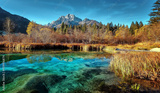 Amazing nature scenery. Zelenci lake in Slovenia. Beautiful azure lake with mountains and majestic mount in the background. Panorama autumn landscape photo. Concept of an ideal resting place.