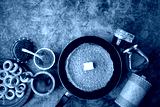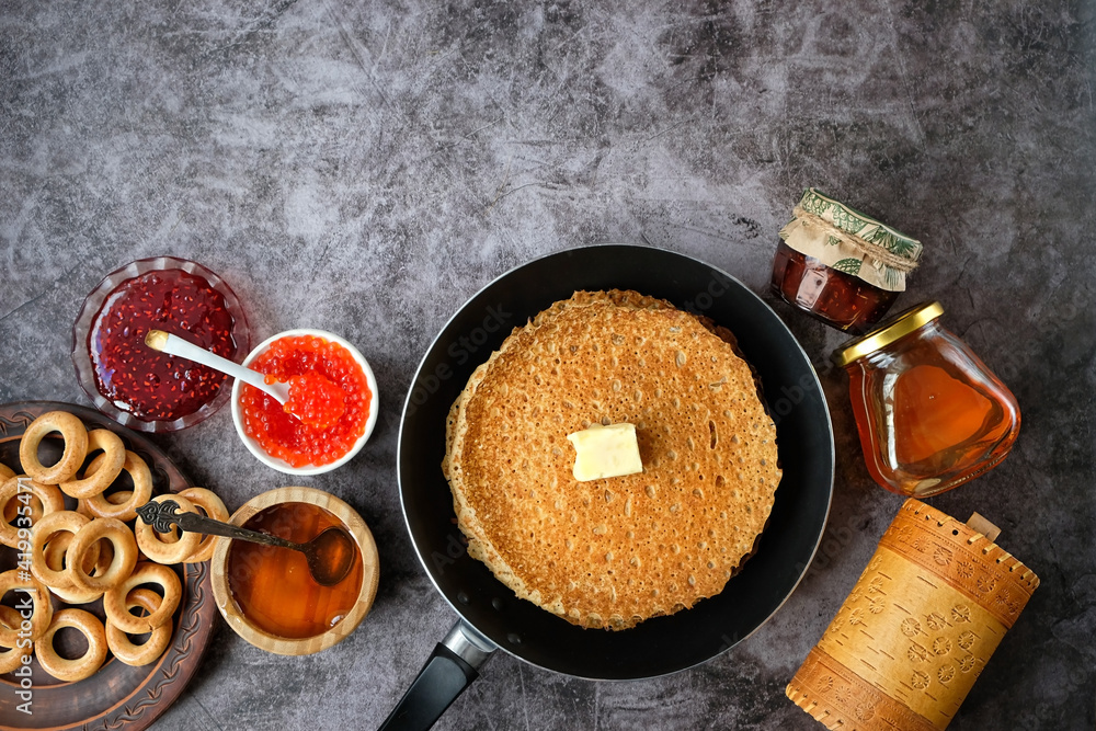 pancakes on frying pan, red caviar, jam, honey on dark background. Maslenitsa holiday, pancakes week. traditional slavic festival meal. flat lay