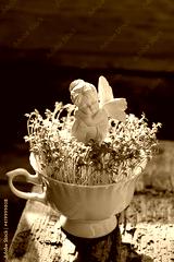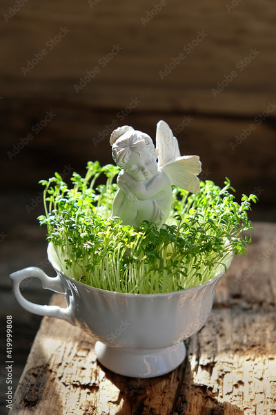 Cute angel fairy and green grass in cup. love and tenderness concept. spring season