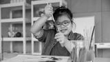 Young Asian down syndrome little girl sitting at desk with colors and painting with concentrated and calm. painting. Concept for education for disabled kid