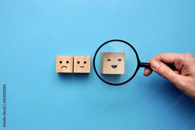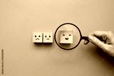 Wooden cubes with icons of emotions: JOY, CALM, SADNESS. A person makes a choice in favor of joy and optimism