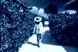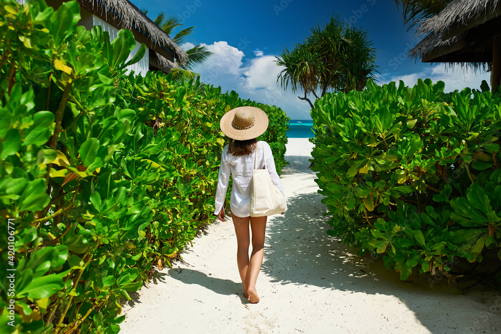 Woman with bag and sun hat going to beach
