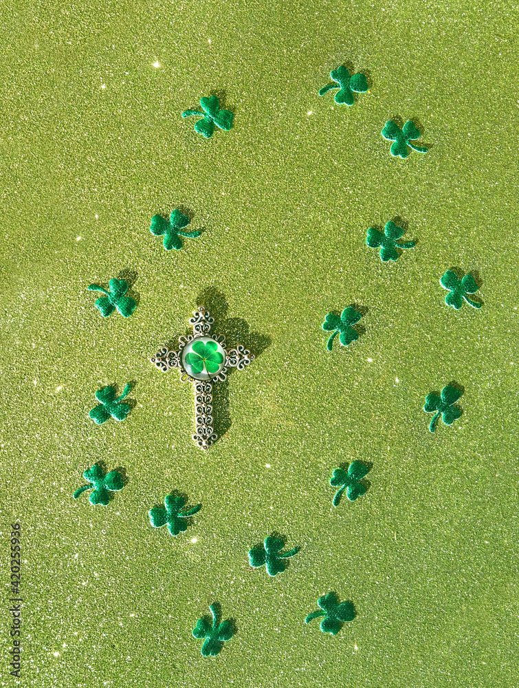 Cross with decorative Shamrocks leaves - symbol of st.Patrick, ireland church holiday. shiny green glittering textured background. saint Patrick's day festive concept. flat lay