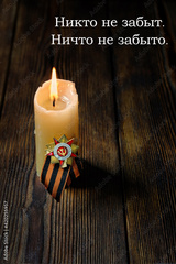 Victory Day background. Russian text - No one is forgotten. Nothing is forgotten. candle to memory of war, date 9 may. St.George ribbon, military order and candle on dark background