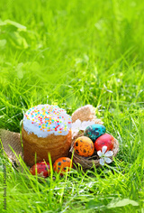 easter holiday concept. Easter cake, flowers and colorful painted eggs. spring festive traditional scene. copy space