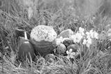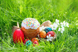 Easter cake, candle, colorful eggs and flowers in grass. Happy Easter concept. spring festive traditional scene.