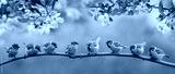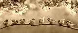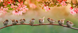 little funny birds and birds chicks sit on the branches of an apple tree with pink flowers in a sunny spring garden