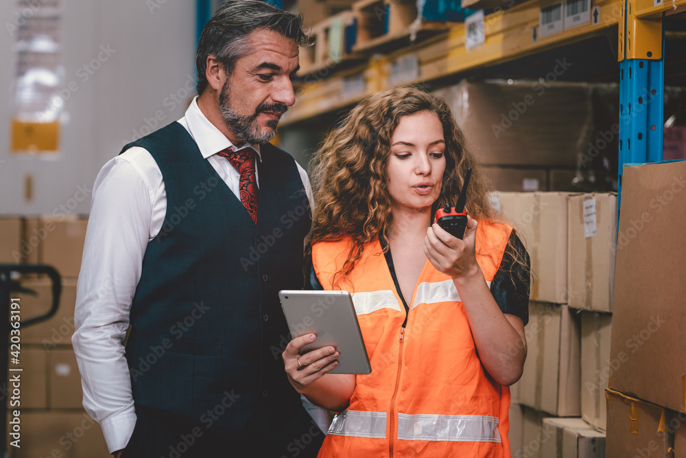 Industry workers and engineer posing under inspection and checking production process on factory warehouse by tablet ,they wearing casual uniform and safety helmet in work.