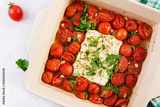 Preparation of ingredients for fetapasta. Trending Feta bake pasta recipe made of cherry tomatoes, feta cheese, garlic and herbs. Top view, above, copy space.