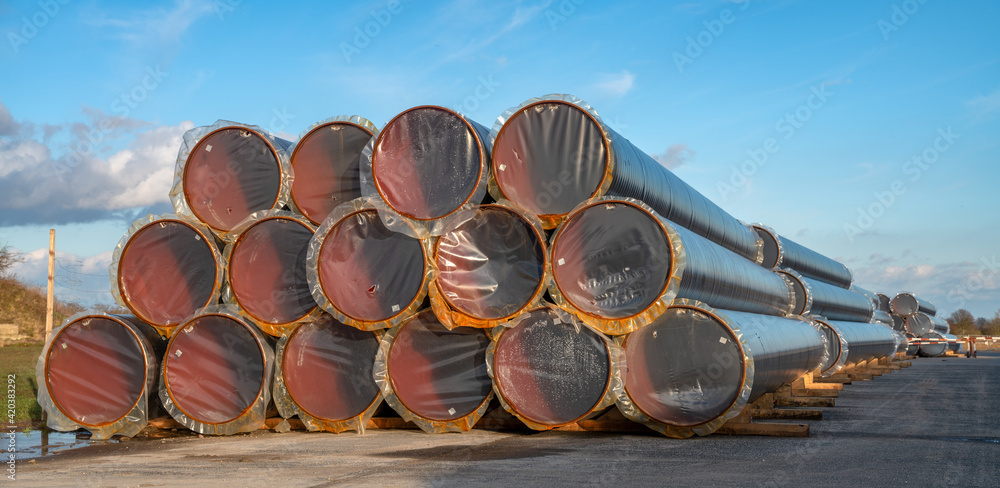 A stack of pipes on the construction site of a gas pipeline that will be laid on the seabed