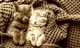 Couple cute kittens in love sleeping on gray soft knitted blanket. Cats rest napping on bed have sweet dreams. Feline love friendship on valentine day. Comfortable pets sleep at cozy home. Copy space