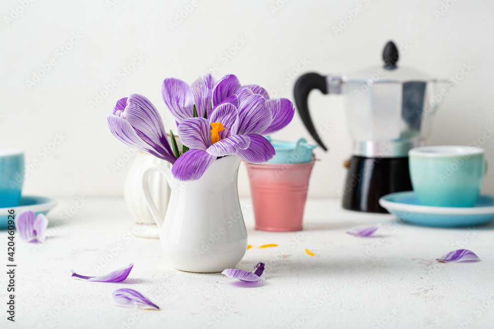 Spring flowers in jug on white table on coffee cup, breakfast concept