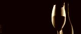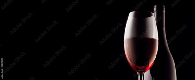 A glass and a bottle of red wine on a black background. panoramic photo, copy space
