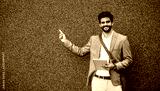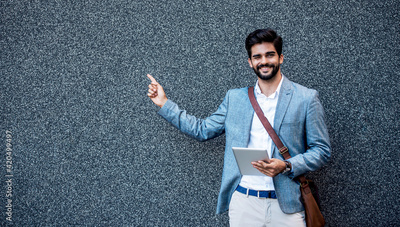 Young businessman is pointing fingers aside at copy space for your text advertisement. Business, education, lifestyle concept
