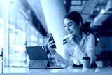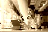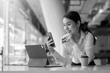 Young Asian businesswoman enjoy shopping online using credit card at a coffee shop.