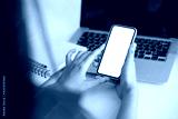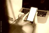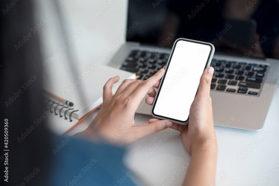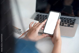 Image. Woman holding a smartphone blank white screen at the office.