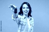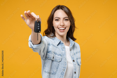 Young smiling happy satisfied excited successful brunette woman 20s in denim shirt white t-shirt hold in hands giving car keys show thumb up like gesture isolated on yellow background studio portrait.