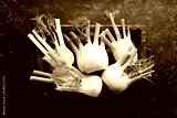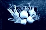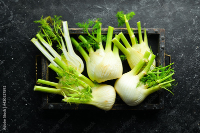 Fresh organic fennel bulbs in a wooden box. Healthy food. Top view. Free space for your text.