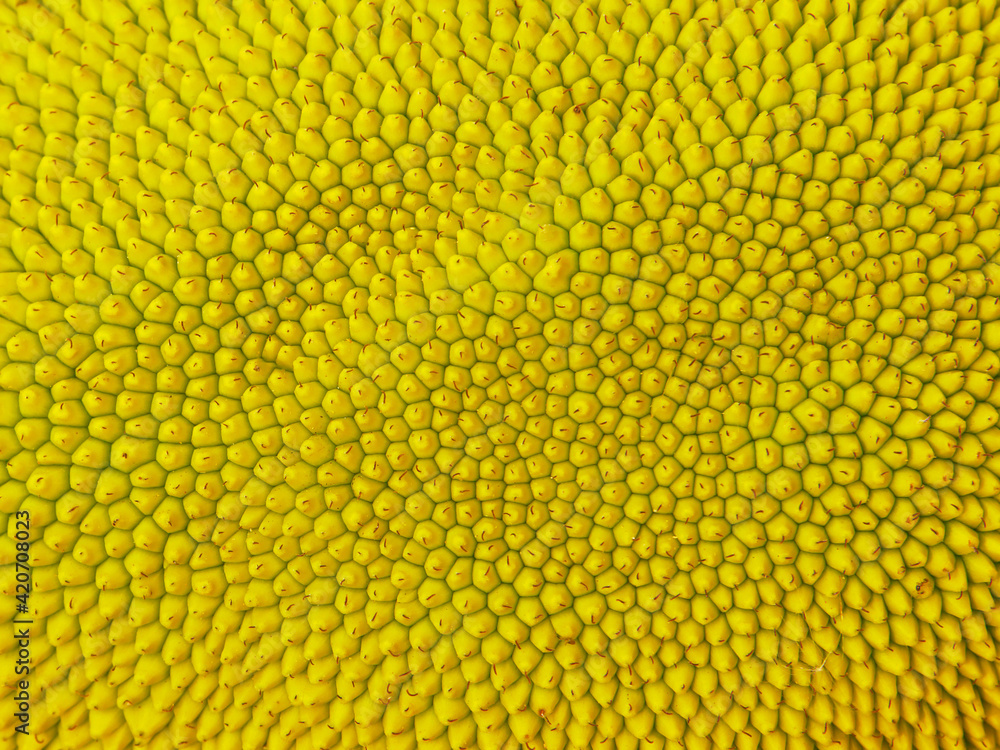 abstract yellow nature blur background of young jackfruit by closeup texture of spiky skin fruit of jack tree for food or graphic design