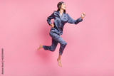 Full length body size side profile photo of girl wearing nightwear jumping running on pajama party isolated on pastel pink color background