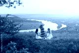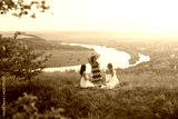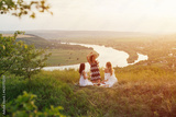 Three female friends is having picnic on the hill with river on the background. Perfect summer atmosphere.