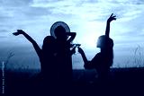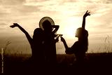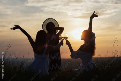 Female friends celebrating and drinking wine in a romantic setting at sunset.